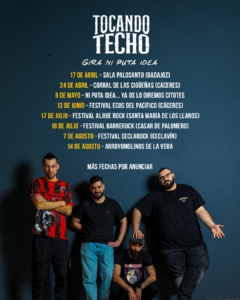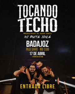 Tocando Techo es una banda de rock formada en 2018 en Casar de Cáceres por Alberto Pajares, Juan Jesús Espada, Ángel Cortes y Carlos Gómez. Con un sonido único, han cautivado a su audiencia con letras emotivas y melodías pegajosas. Desde sus comienzos en la escena local, han ganado seguidores fieles gracias a su energética presencia en el escenario y su compromiso con la autenticidad artística.